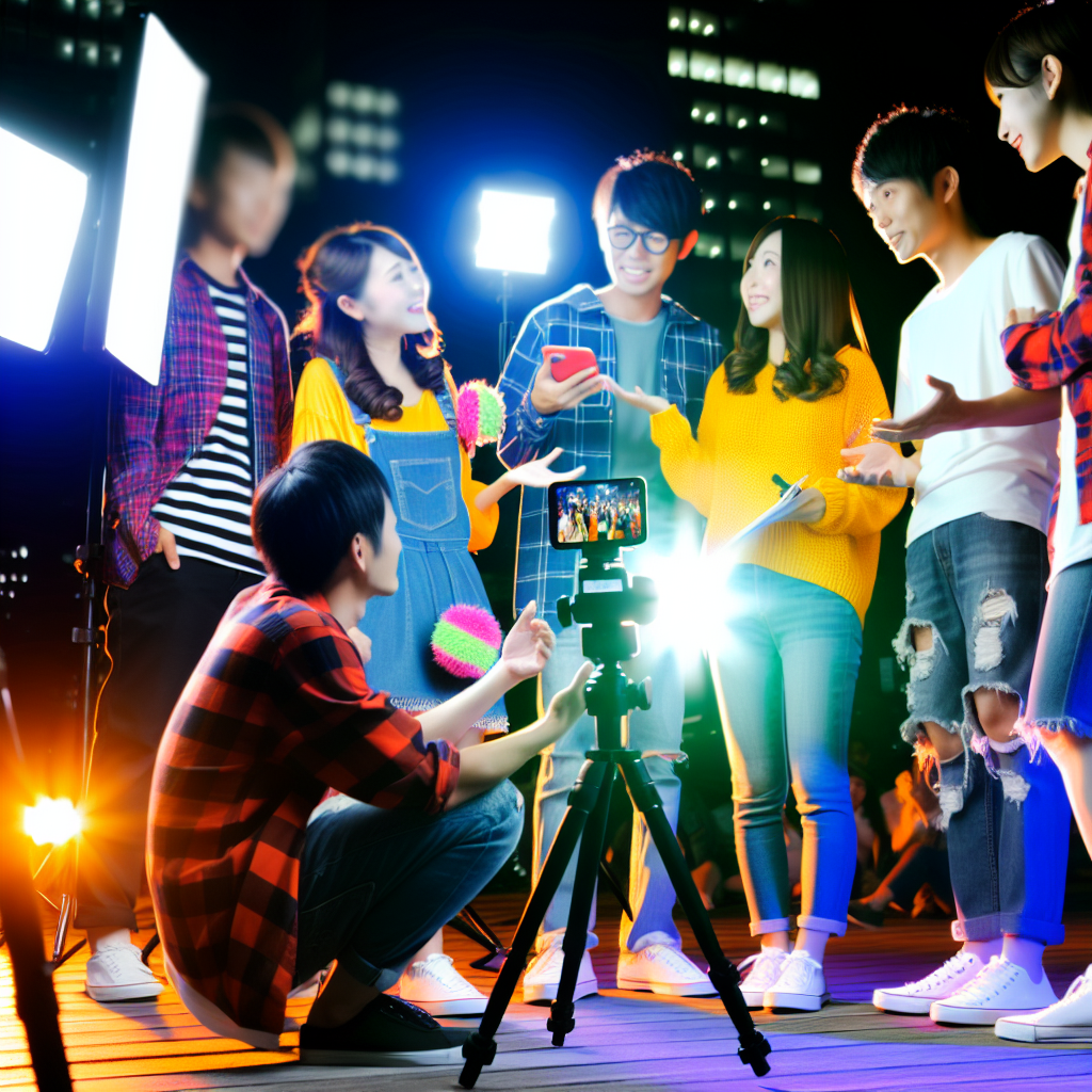 A dynamic scene depicting a group of young Japanese individuals engaging in a TikTok video shoot. They are brainstorming and discussing content ideas, surrounded by colorful props and a smartphone on a tripod. The atmosphere is lively and creative, with bright lighting that captures the essence of social media engagement.