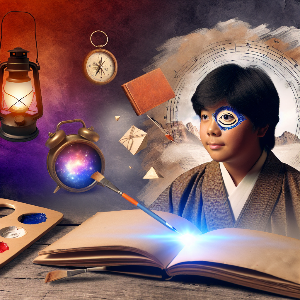 A mysterious and inspiring scene featuring a young Japanese person exploring their hidden talents and unique life story, surrounded by elements that symbolize creativity and discovery, with warm lighting to reflect a sense of wonder and potential.