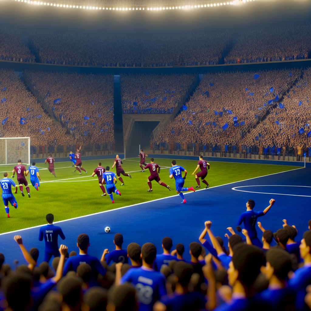 A dramatic football match scene featuring an unexpected turnaround, showcasing a clash between Intel and Roma. Capture the tension and excitement in the atmosphere, with fans on the edge of their seats and expressions of shock and joy as the game reaches its thrilling conclusion.