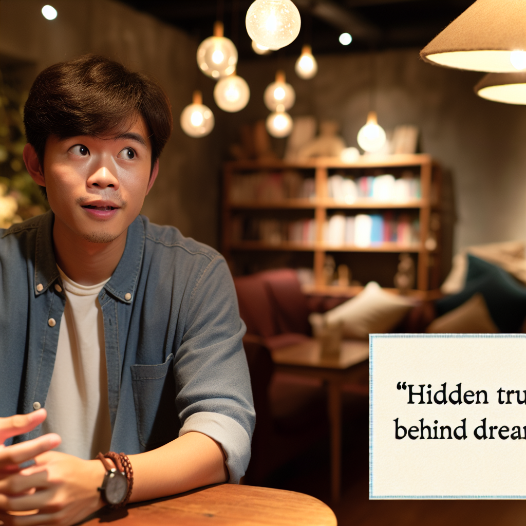 A young Japanese man dressed casually, with an intrigued expression, sitting in a cozy café, sharing his thoughts about hidden truths behind dreams. The atmosphere is warm and inviting, with soft lighting and bookshelves in the background.