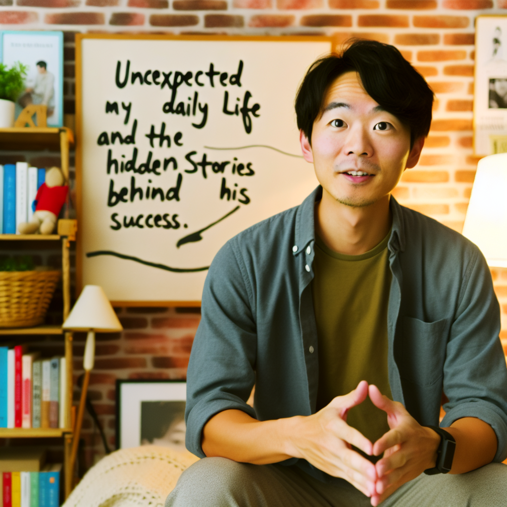 A young Japanese man named Masahiro Sakurai, casually dressed, sitting in a cozy, well-lit room, sharing insights about his unexpected daily life and the hidden stories behind his success, surrounded by books and inspirational posters.