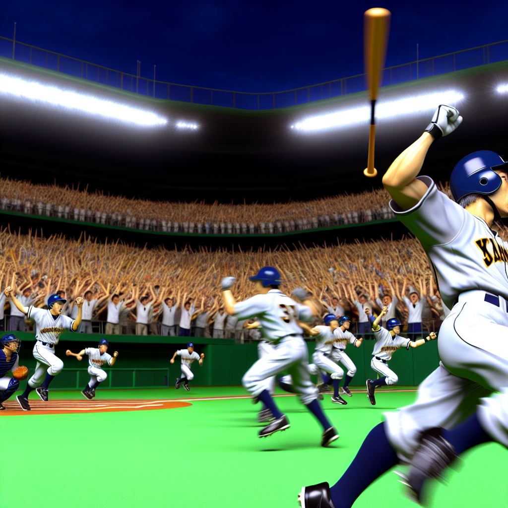 A thrilling moment in Japanese professional baseball, featuring an unexpected comeback. Capture the excitement of fans cheering in the stadium, with vivid expressions and dynamic gameplay, showcasing the intensity of the game at its climax.