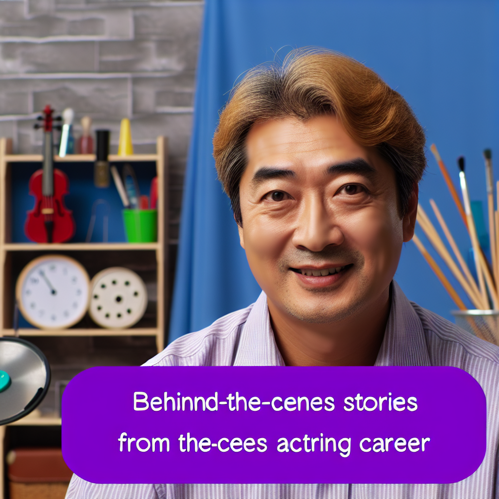 A Japanese actor, Akira Yasuda, sharing insights about the behind-the-scenes of his acting career, with a candid expression and a warm smile. He is surrounded by elements that hint at his unexpected hobbies, such as musical instruments or art supplies, creating a cozy and inviting atmosphere.