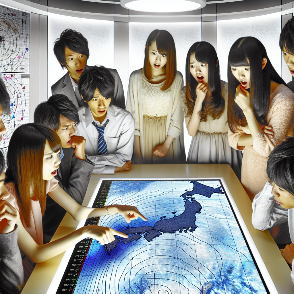A group of young Japanese individuals gathered around a weather map, looking curious and engaged. They are discussing weather predictions, with expressions of surprise and intrigue. The setting is bright and modern, with elements of science equipment, charts, and graphs in the background, creating an atmosphere of exploration and discovery.