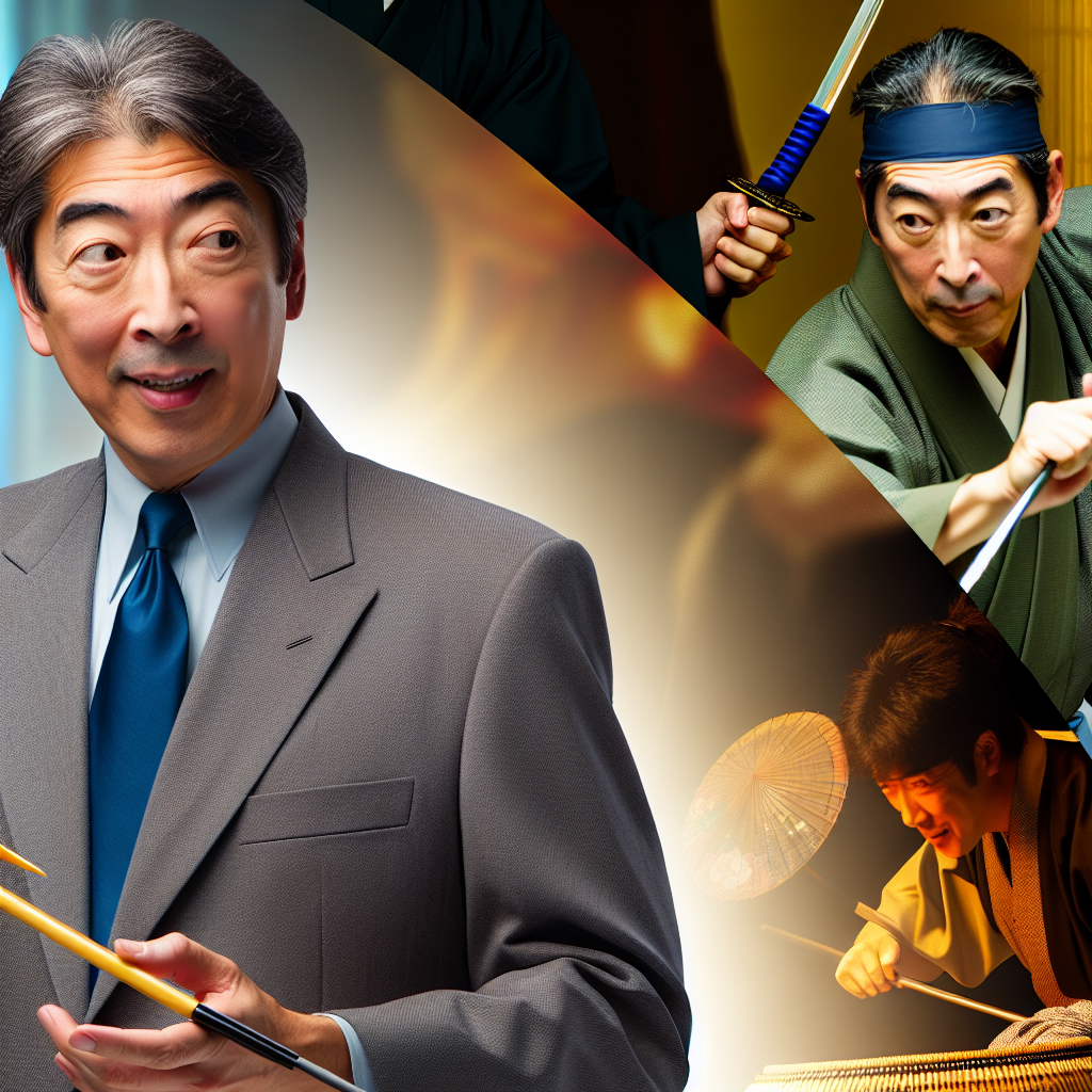 A Japanese politician with a hidden talent: Tamura Norihisa, depicting an unexpected side of him, perhaps in a creative or artistic setting that showcases his unique skills beyond politics. The scene should have a dynamic and engaging atmosphere, highlighting his personality and abilities.