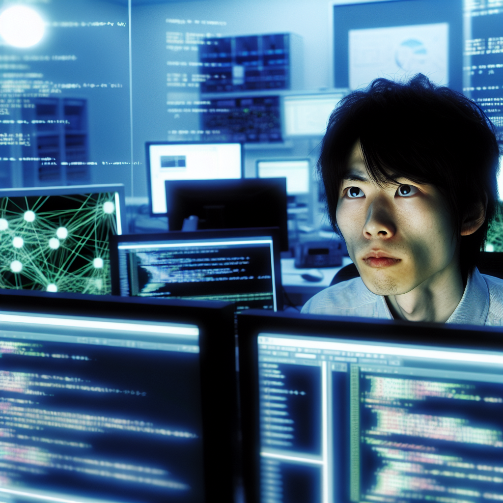 A young Japanese IT architect working on a complex project, surrounded by screens displaying code and architectural diagrams. The atmosphere reflects both the challenges and successes of the job, with a mix of determination and creativity in their expression. The workspace is modern and tech-oriented, showcasing tools of the trade.