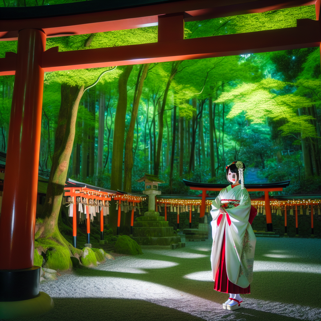 A young Japanese shrine maiden, dressed in traditional miko attire, standing beneath a torii gate at a serene shrine. The background features a lush, mystical forest with ethereal lights and soft shadows, hinting at a secret, enchanting world beyond the ordinary.